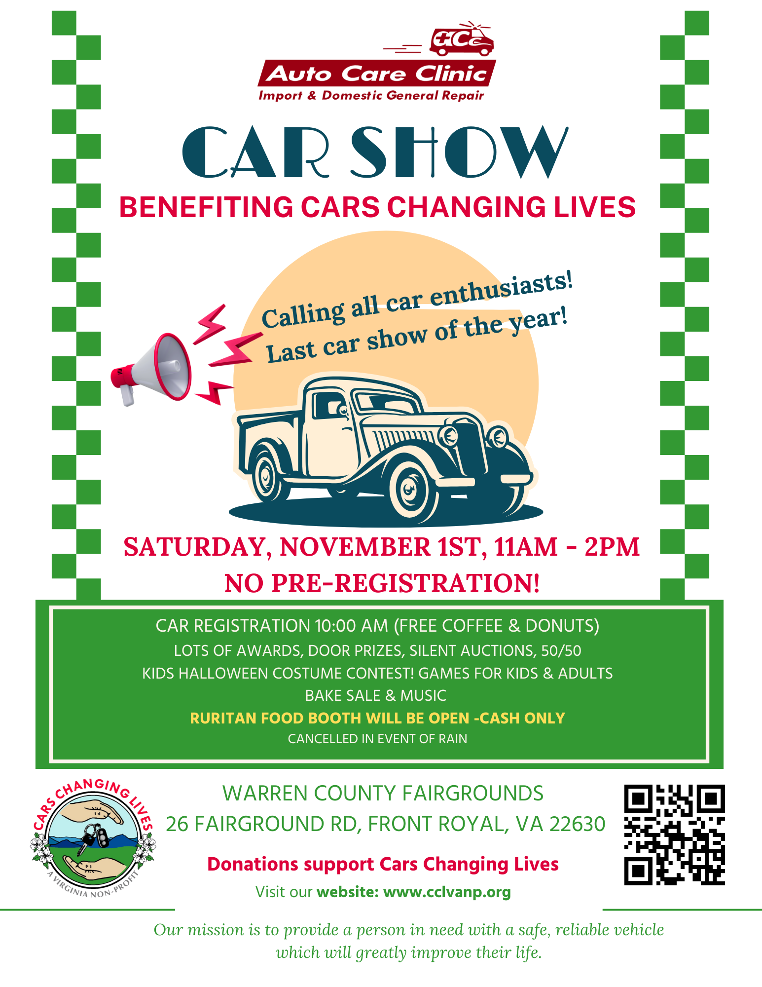 Cars Changing Lives Car and Truck Show is Saturday, Nov 1st., so polish your vehicle and get ready to show it off! Don’t miss your chance to show off your wheels, have fun, and make a difference! Lots of activities for kids & adults❤️